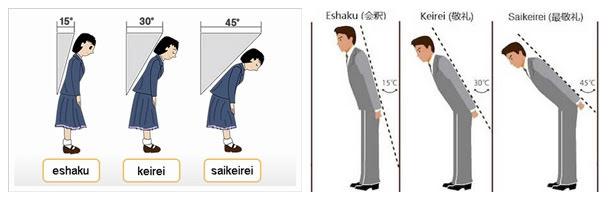 - Eshaku: bow with a 15° inclination. Common among people of the same hierarchy and can be used as a casual way of greeting or a polite way of thanking.